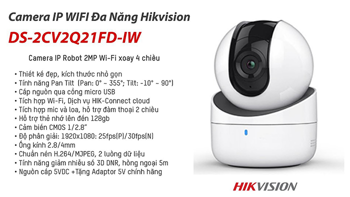 Camera IP Hikvision DS-2CV2Q01FD-IW hình ảnh HD1080P, nhìn xa 5-10m, hỗ trợ các tính năng chống ngược sáng kỹ thuật số, tích hợp Micro, loa đàm thoại 2 chiều. Sản phẩm camera IP không dây này cho chất lượng, gọn nhẹ, dễ sử dụng đảm bảo hài lòng khách hàng khó tính nhất. Đây là dòng camera all in one của hãng HIKVISION với nhiều tính năng độc đáo được kết hợp trên 1 chiếc camera. Xoay 4 chiều, quan sát rõ nét, có khe cắm thẻ nhớ hỗ trợ lên tới 128GB, camera phù hợp lắp đặt cho việc trông trẻ em, nhà thuốc tây, nhà ở, quan sát người làm việc….