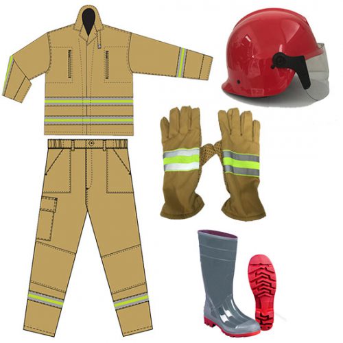 Quần áo bảo hộ phòng cháy chữa cháy nguyên bộ cùng các phụ kiện như ủng, nón, mặt nạ phòng độc thiết kế đúng quy định của Luật PCCC 2001.